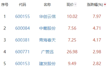 其中,华创云信、中葡股份、青海春天、广誉远、建发股份位列板块涨幅前五位,涨幅分别为7.97%、4.71%、4.17%、2.98%、2.82%。