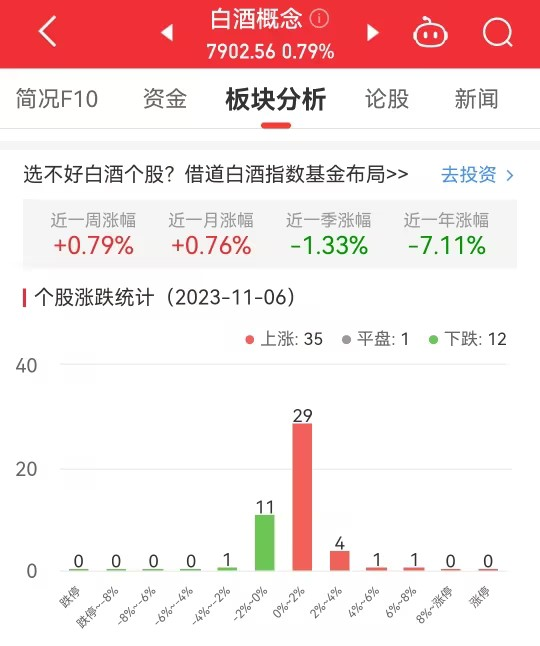 中国经济网北京11月6日讯今日,白酒概念板块整体涨幅0.79%,其中35只股票上涨,1只股票平盘,12只股票下跌。