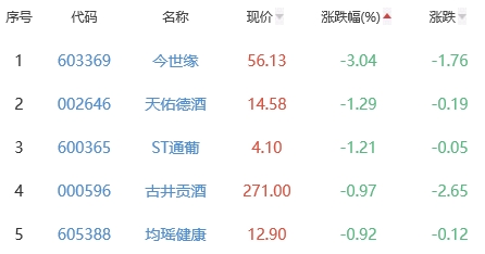 今世缘、天佑德酒、ST通葡、古井贡酒、均瑶健康位列涨幅榜后五位,涨幅分别为-3.04%、-1.29%、-1.21%、-0.97%、-0.92%。
