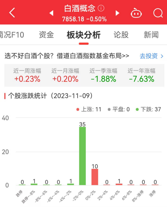中国经济网北京11月9日讯今日,白酒概念板块整体跌幅0.50%,其中11只股票上涨,0只股票平盘,37只股票下跌。