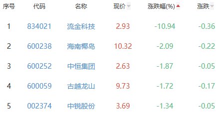 流金科技、海南椰岛、中恒集团、古越龙山、中锐股份位列涨幅榜后五位,涨幅分别为-10.94%、-2.09%、-1.87%、-1.72%、-1.34%。