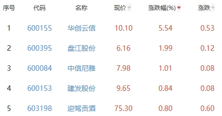 其中,华创云信、盘江股份、中信尼雅、建发股份、迎驾贡酒位列板块涨幅前五位,涨幅分别为5.54%、1.99%、1.01%、0.84%、0.80%。