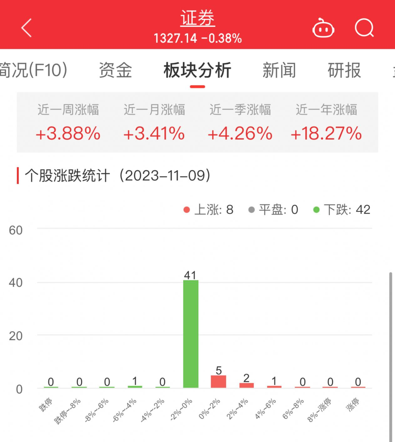 中国经济网北京11月9日讯 今日,证券板块整体跌幅0.38%,其中8只股票上涨,42只股票下跌。