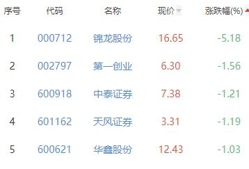 锦龙股份、第一创业、中泰证券、天风证券、华鑫股份位列涨幅榜后五位,涨幅分别为-5.18%、-1.56%、-1.21%、-1.19%、-1.03%。