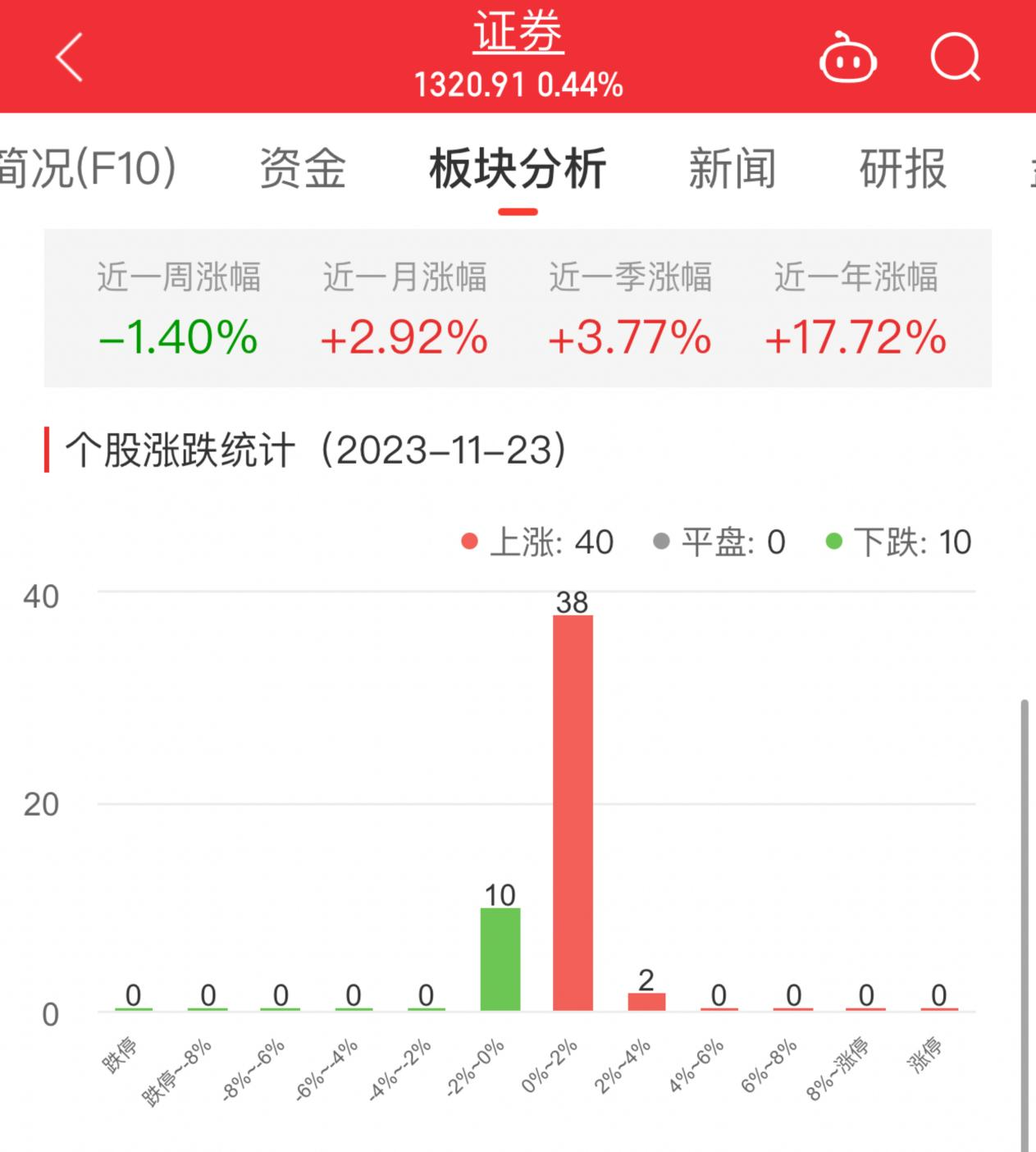 中国经济网北京11月23日讯 今日,证券板块整体涨幅0.44%,其中40只股票上涨,10只股票下跌。