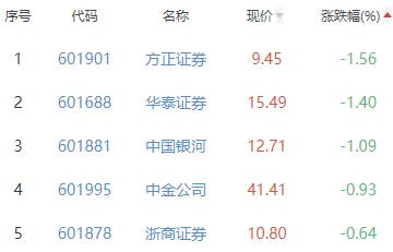 方正证券、华泰证券、中国银河、中金公司、浙商证券位列涨幅榜后五位,涨幅分别为-1.56%、-1.40%、-1.09%、-0.93%、-0.64%。