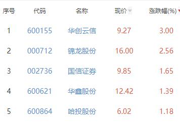 其中,华创云信、锦龙股份、国信证券、华鑫股份、哈投股份位列板块涨幅前五位,涨幅分别为3.00%、2.56%、1.65%、1.39%、1.18%。