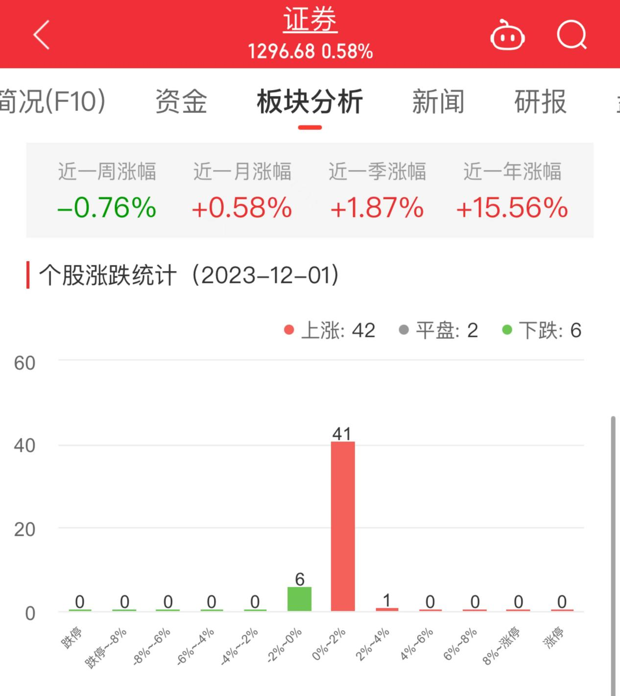 中国经济网北京12月1日讯 今日,证券板块整体涨幅0.58%,其中42只股票上涨,2只股票平盘,6只股票下跌。