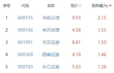 其中,华创云信、申万宏源、方正证券、西南证券、长江证券位列板块涨幅前五位,涨幅分别为2.15%、1.55%、1.50%、1.46%、1.26%。