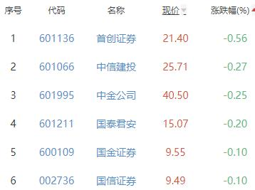 首创证券、中信建投、中金公司、国泰君安、国金证券、国信证券位列涨幅榜后五位,涨幅分别为-0.56%、-0.27%、-0.25%、-0.20%、-0.10%、-0.10%。