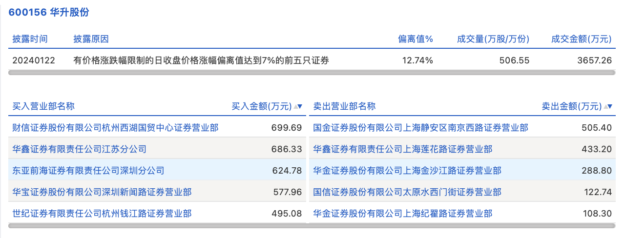 1月22日,华升股份今日涨停,全天换手率达1.26%,振幅达0%。龙虎榜数据显示,营业部席位合计净买入1625.4万元。其中,财信证券杭州西湖国贸中心证券营业部、华鑫证券江苏分公司分别买入699.69万元、686.33万元;国金证券上海静安区南京西路证券营业部、华鑫证券上海莲花路证券营业部分别卖出505.40万元、433.20万元。
