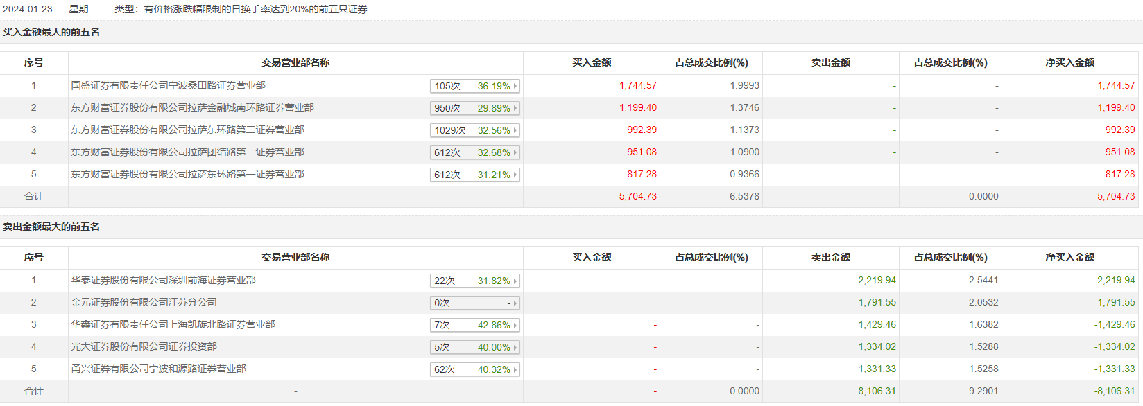 具体来看,知名游资现身龙虎榜,华泰证券深圳前海证券营业部、金元证券江苏分公司分别卖出2219.94万元、1791.55万元;宁波桑田路(国盛证券宁波桑田路证券营业部)、东方财富证券拉萨金融城南环路证券营业部分别买入1744.57万元、1199.40万元。