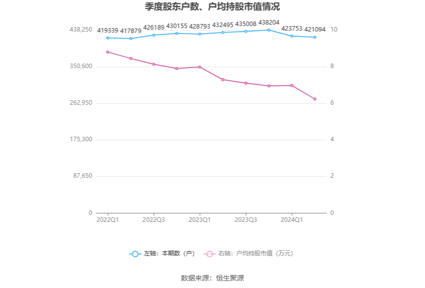 筹码集中度方面,截至2024年上半年末,公司股东总户数为42.11万户,较一季度末下降了2659户,降幅0.63%;户均持股市值由一季度末的6.97万元下降至6.23万元,降幅为10.62%。