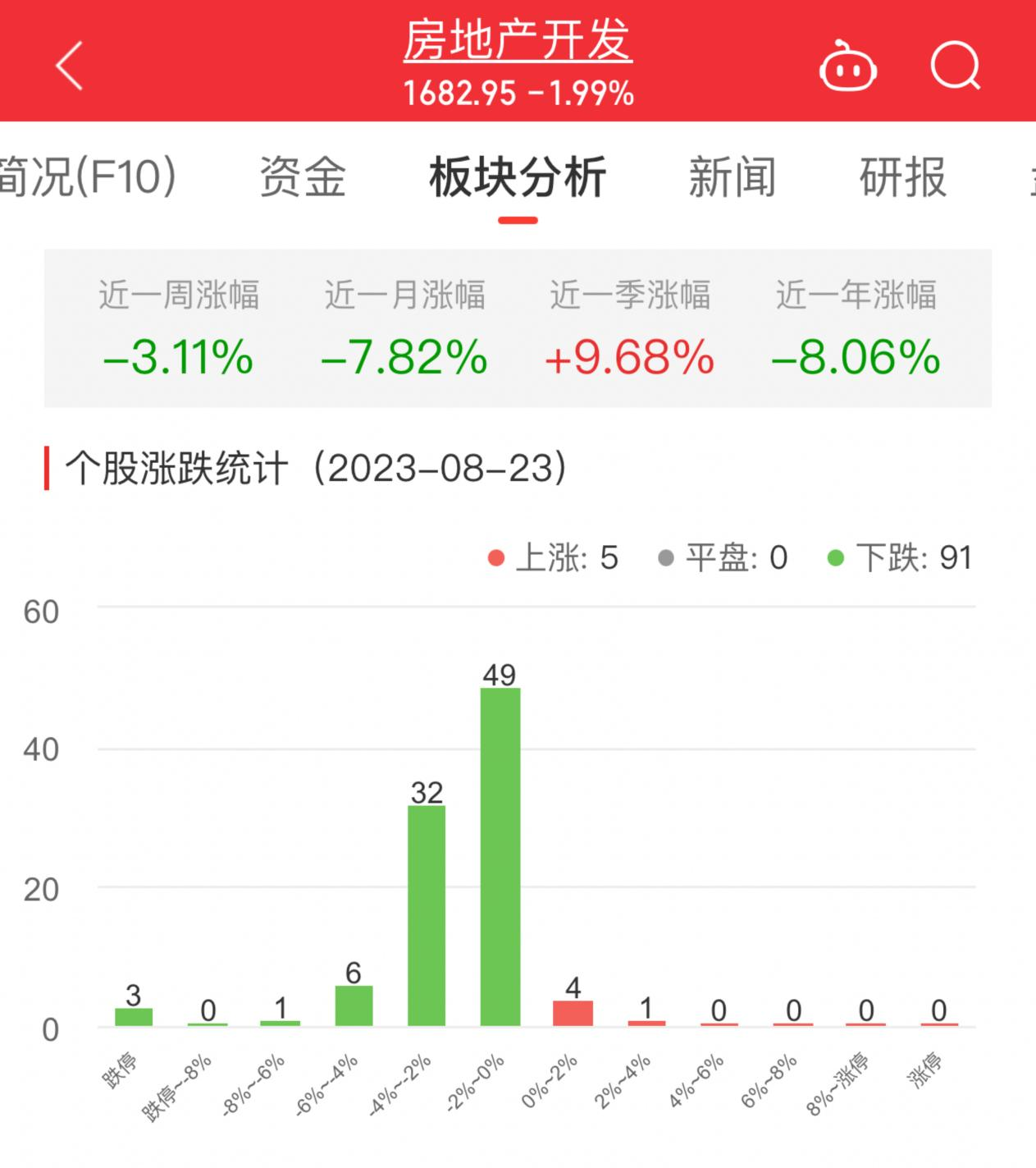 中国经济网北京8月23日讯 今日,房地产开发板块整体跌幅1.99%,其中5只股票上涨,91只股票下跌。