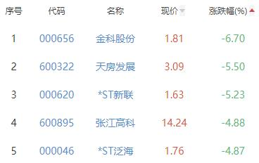 金科股份、天房发展、*ST新联、张江高科、*ST泛海位列涨幅榜后五位,涨幅分别为-6.70%、-5.50%、-5.23%、-4.88%、-4.87%。