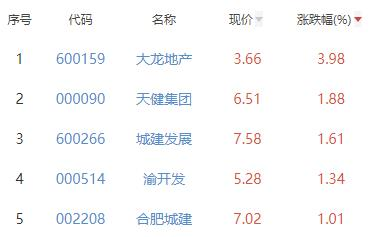 其中,大龙地产、天健集团、城建发展、渝开发、合肥城建位列板块涨幅前五位,涨幅分别为3.98%、1.88%、1.61%、1.34%、1.01%。