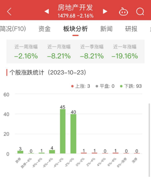 中国经济网北京10月23日讯今日,房地产开发板块整体涨幅-2.16%,其中3只股票上涨,93只股票下跌。