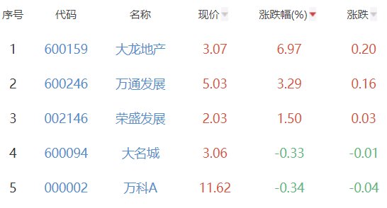 其中,大龙地产、万通发展、荣盛发展、大名城、万科A位列板块涨幅榜前五位,涨幅分别为6.97%、3.29%、1.50%、-0.33%、-0.34%。