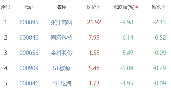 张江高科、同济科技、金科股份、ST数源、*ST泛海位列板块涨幅榜后五位,涨幅分别为-9.98%、-6.14%、-5.49%、-5.04%、-4.95%。