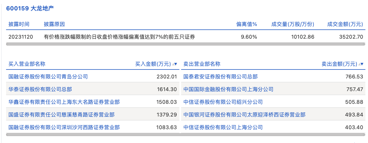 11月20日,大龙地产今日涨停,全天换手率达12.17%,振幅达7.62%。龙虎榜数据显示,营业部席位合计净买入4960.13万元。其中,国融证券青岛分公司、华泰证券总部分别买入2302.01万元、1614.30万元;国泰君安证券总部、中国国际金融上海分公司分别卖出766.53万元、757.47万元。