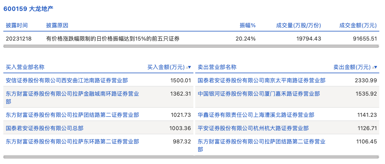 12月18日,大龙地产今日跌1.98%,龙虎榜数据显示,上榜营业部席位全天成交1.31亿元,占当日总成交金额比例为14.31%。其中,买入金额为5874.73万元,卖出金额为7241.3万元,合计净卖出1366.57万元。