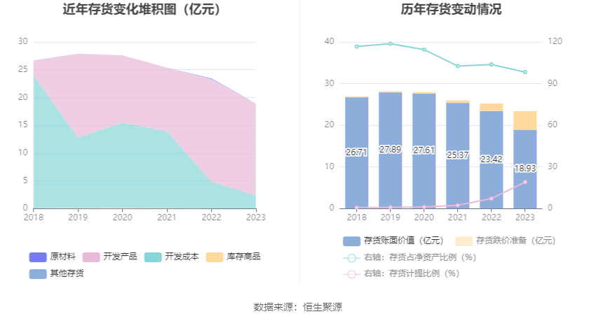从存货变动来看,截至2023年年末,公司存货账面价值为18.93亿元,占净资产的98.28%,较上年末减少4.49亿元。其中,存货跌价准备为4.47亿元,计提比例为19.11%。