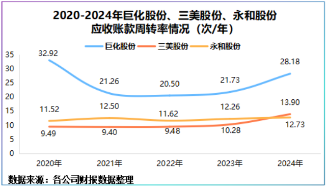 2020-2024年,巨化股份应收账款周转率达20次/年以上,三美股份、永和股份均低于14次/年,侧面说明巨化股份对下游的强话语权。