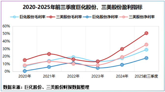 2025年前三季度,三美股份毛利率高达50.73%,净利率达35.67%,均远高于巨化股份的28.86%和17.77%。