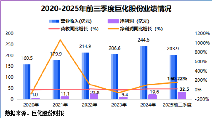 2025年三季度,巨化股份实现净利润32.5亿元,同比增长160.22%,单是第三季度,其净利润就近12亿元,同比增幅高达186.55%。