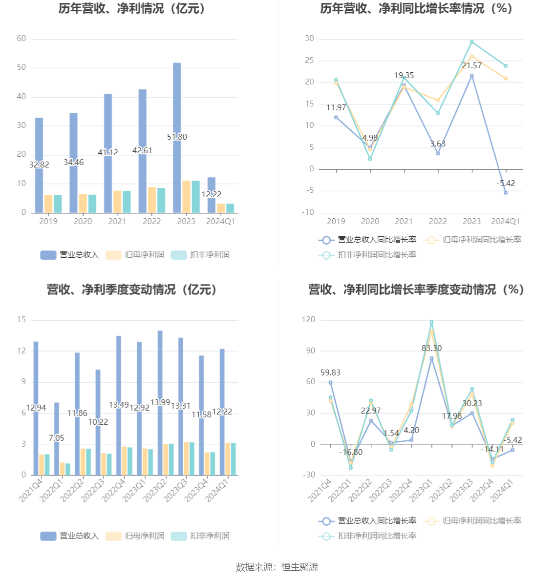2024年第一季度,公司毛利率为56.08%,同比上升10.08个百分点;净利率为35.36%,较上年同期上升7.57个百分点。