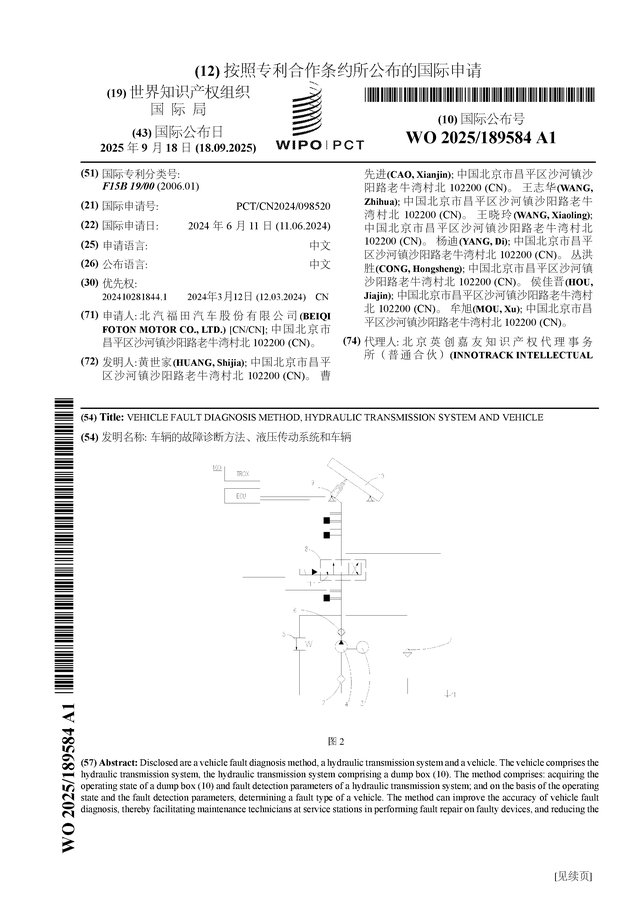 福田汽车公布国际专利申请:“车辆的故障诊断方法、液压传动系统和车辆”