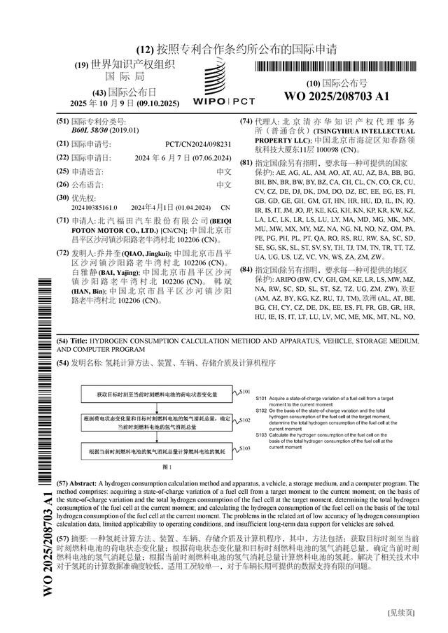 福田汽车公布国际专利申请:“氢耗计算方法、装置、车辆、存储介质及计算机程序”