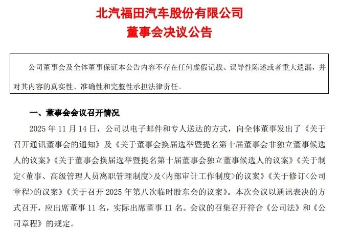 11月24日晚间,北汽福田汽车股份有限公司发布董事会决议公告。