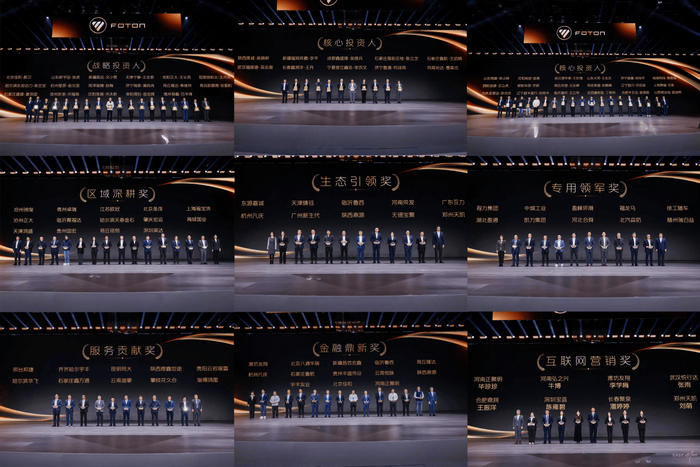 为凝聚合作伙伴共创未来的信心与决心,福田汽车常务副总经理鹿政华主持了核心投资人和战略投资人授牌仪式,现场为45位长期与公司同频共振的战略及核心投资人授牌,他们将获得"专属政策支持、专业人才培养、战略协同共创"等全方位赋能。同时,大会还对全年表现优异的经销商分别授予"区域深耕奖"、"生态引领奖"、“专用领军奖”、"服务贡献奖"、“金融领航奖”、“互联网营销奖”荣誉。
