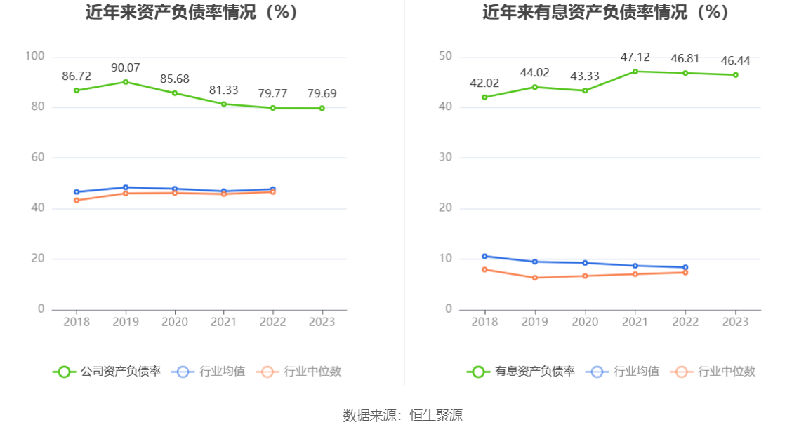 在偿债能力方面,公司2023年年末资产负债率为79.69%,相比上年末下降0.08个百分点;有息资产负债率为46.44%,相比上年末下降0.37个百分点。