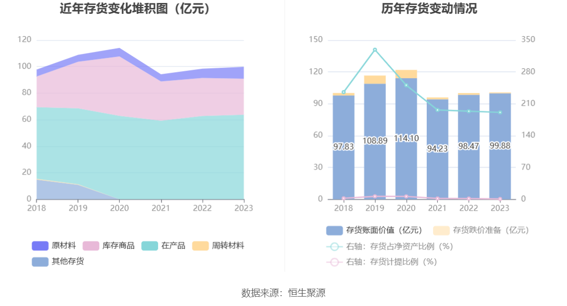 从存货变动来看,截至2023年年末,公司存货账面价值为99.88亿元,占净资产的191.14%,较上年末增加1.41亿元。其中,存货跌价准备为7963.58万元,计提比例为0.79%。