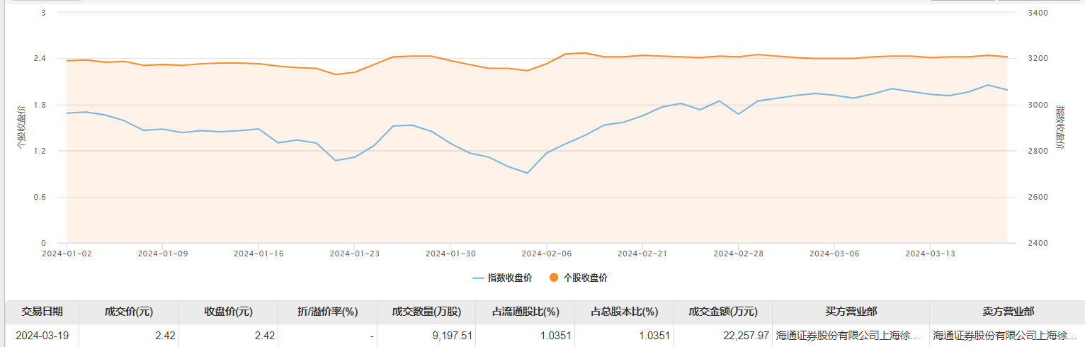 3月19日大宗交易成交9197.51万股,成交额2.23亿元,占当日总成交额的65.75%,成交价2.42元,较市场收盘价2.42元持平。