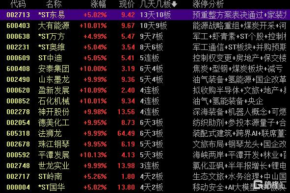 焦点股方面,煤炭股大有能源10天9板、安泰集团6天4板,深地经济概念股神开股份4连板、石化机械4连板,并购重组的盈新发展4连板。