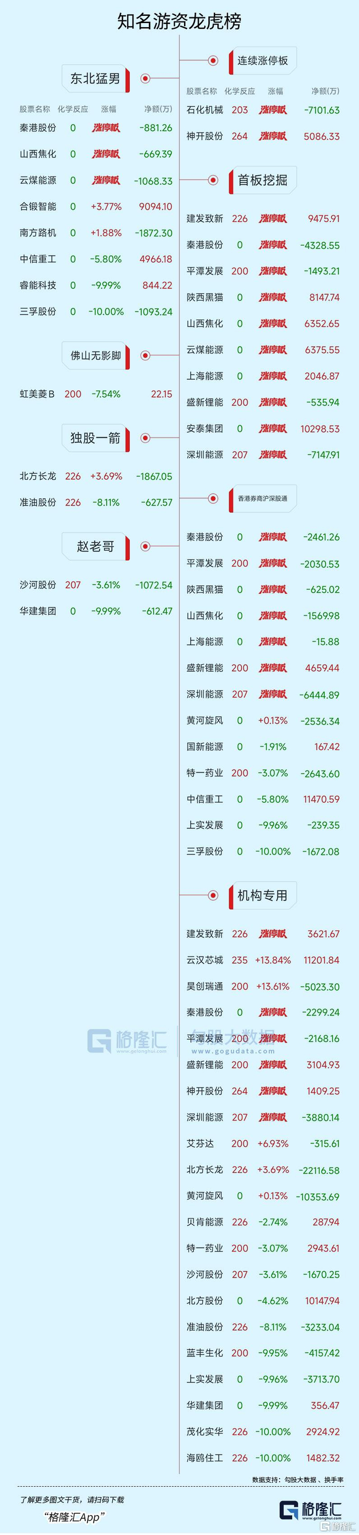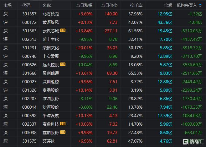 龙虎榜中涉及机构专用席位的个股中,当日净卖出额前三为北方长龙、黄河旋风、蓝丰生化,分别为1.32亿元、1.04亿元、4157.42万元。