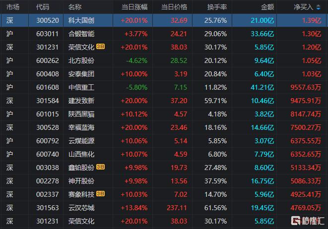 龙虎榜单日净买入额前三为科大国创、合锻智能、北方股份,分别为1.39亿元、1.3亿元、1.05亿元。