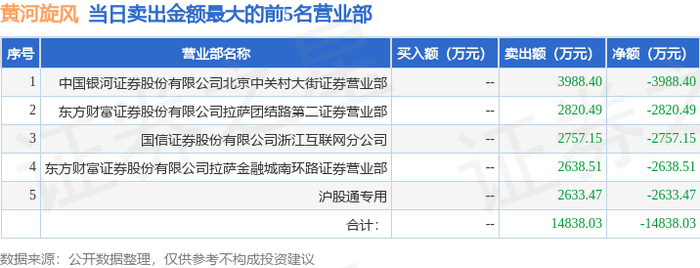 10月27日黄河旋风(600172)龙虎榜数据:游资北京中关村上榜