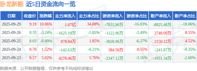 证券之星消息,卧龙新能9月29日涨停收盘,收盘价9.19元。该股于9点47分涨停,未打开涨停,截止收盘封单资金为6370.31万元,占其流通市值0.99%。