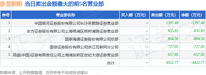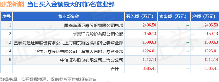 证券之星消息,沪深交易所2025年9月29日公布的交易公开信息显示,卧龙新能(600173)因有价格涨跌幅限制的日收盘价格涨幅偏离值达到7%的前五只证券登上龙虎榜。此次是近5个交易日内第1次上榜。