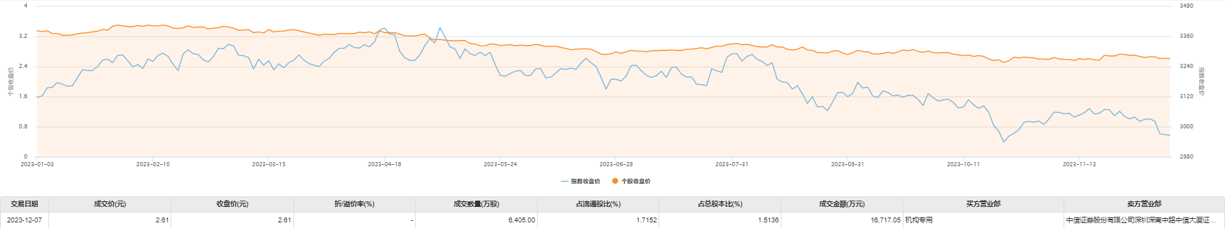 今日大宗交易成交6405万股,成交额1.67亿元,占当日总成交额的85.83%,成交价2.61元,较市场收盘价持平。