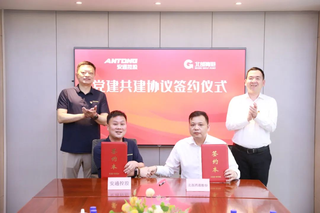 为深入学习贯彻习近平新时代中国特色社会主义思想和党的二十届三中全会精神,加强党建与业务融合,4月18日下午,安通控股与北部湾港股份举行党建共建签约仪式。在安通控股党委副书记、董事总裁楼建强,北部湾港集团党委副书记、副董事长、总经理马正国的共同见证下,安通控股副总裁兼航运中心总经理郭朝阳与北部湾港股份副总经理李凯善分别代表双方签约。