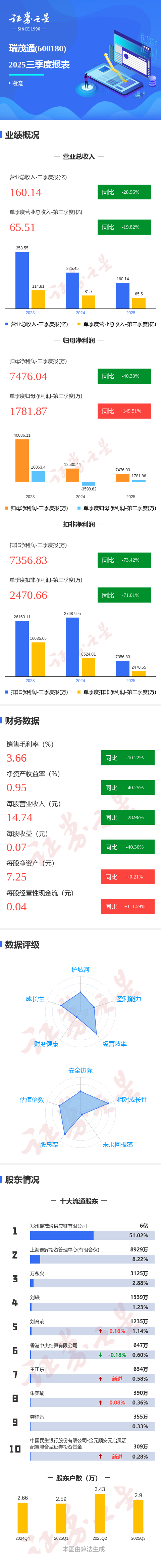 证券之星消息,瑞茂通2025年三季报显示,公司主营收入160.14亿元,同比下降28.97%;归母净利润7476.04万元,同比下降40.34%;扣非净利润7356.83万元,同比下降73.43%;其中2025年第三季度,公司单季度主营收入65.51亿元,同比下降19.83%;单季度归母净利润1781.87万元,同比上升149.52%;单季度扣非净利润2470.66万元,同比下降71.02%;负债率74.29%,投资收益1.72亿元,财务费用2.92亿元,毛利率3.66%。