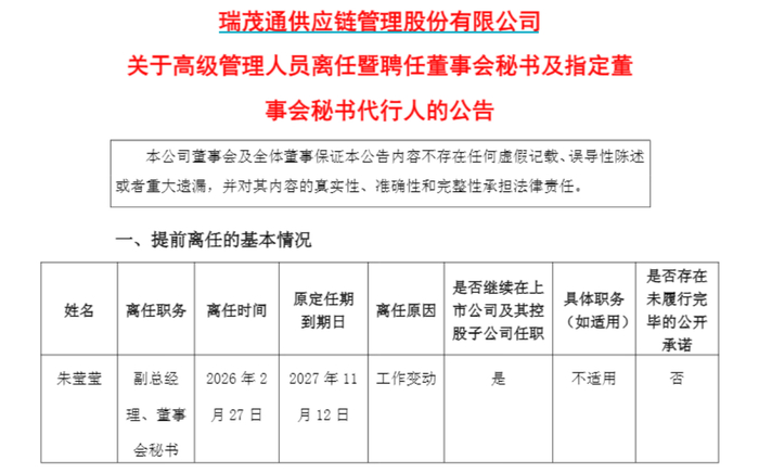 此前,朱莹莹刚于2025年12月31日被聘任为瑞茂通副总经理、董事会秘书。此次辞职距她被聘任仅59天。此次辞去副总经理、董事会秘书职务后,朱莹莹仍在瑞茂通任职。