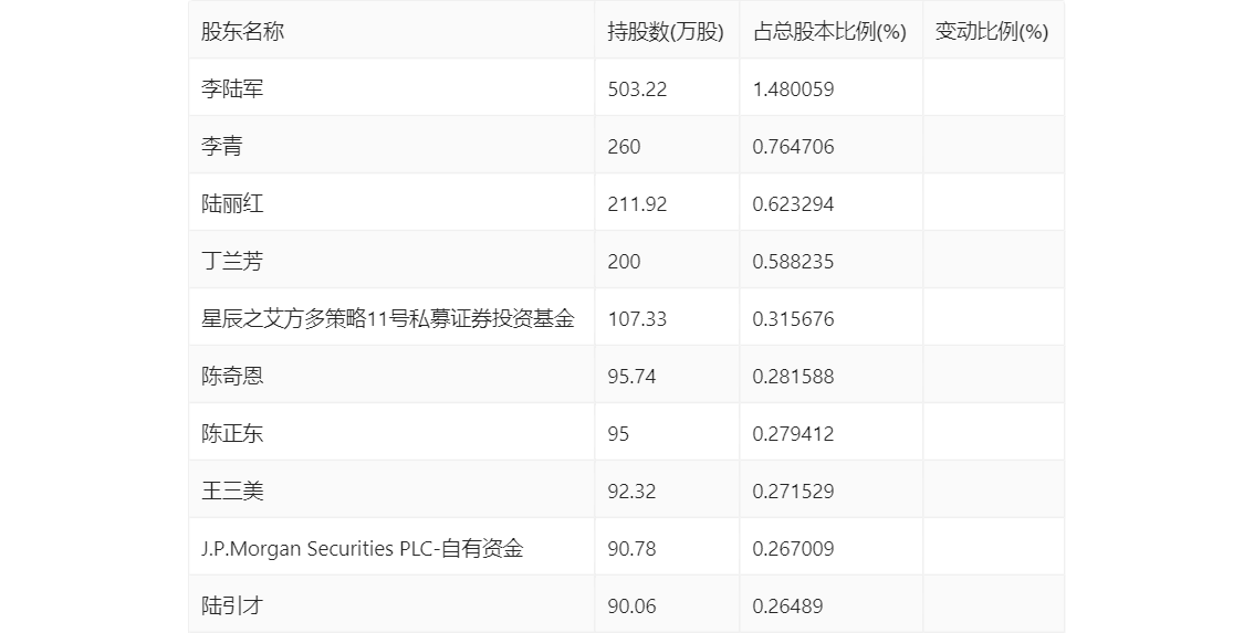 一季报显示,2024年一季度末公司十大流通股东中,新进股东为王三美,取代了上年末的华夏银行股份有限公司-华夏智胜先锋股票型证券投资基金(LOF)。在具体持股比例上,陆丽红、丁兰芳、J.P.Morgan Securities PLC-自有资金、陆引才持股有所下降。