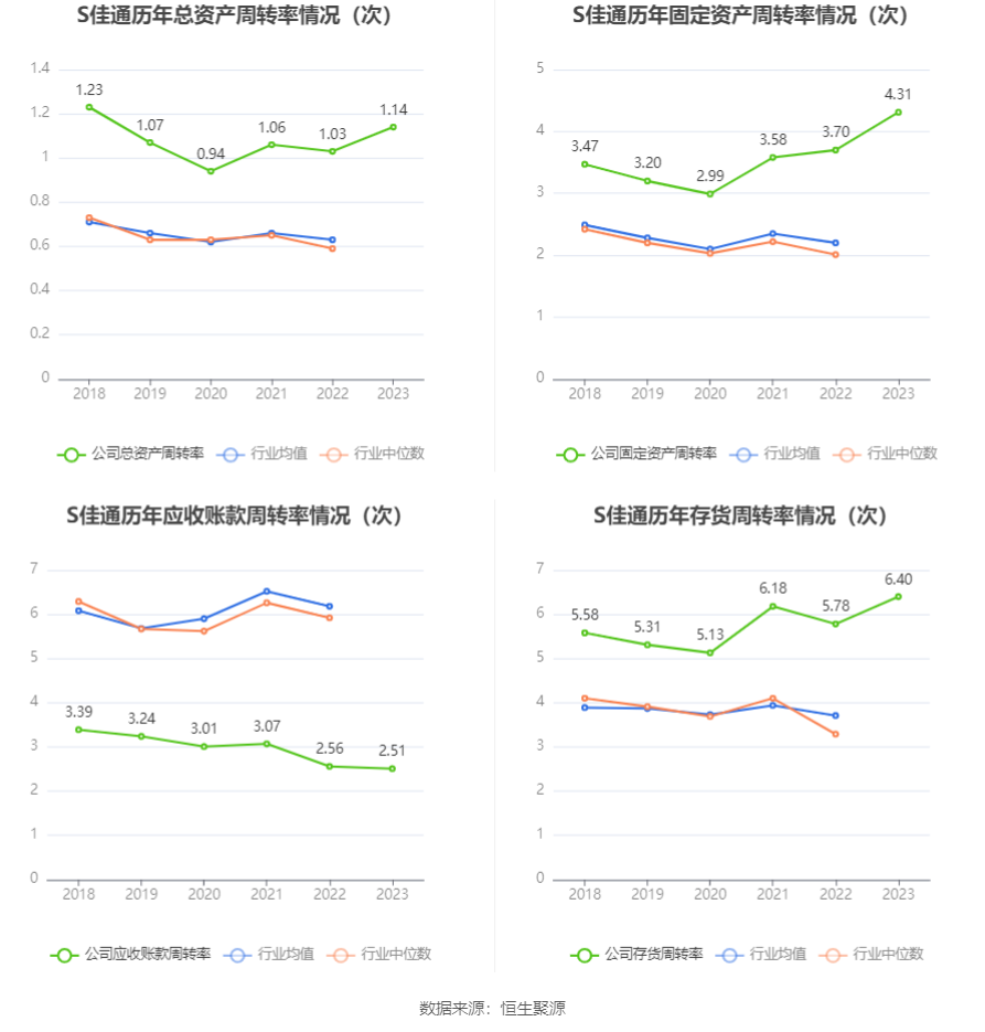 营运能力方面,2023年,公司公司总资产周转率为1.14次,上年同期为1.03次(2022年行业平均值为0.63次,公司位居同行业3/20);固定资产周转率为4.31次,上年同期为3.70次(2022年行业平均值为2.20次,公司位居同行业5/20);公司应收账款周转率、存货周转率分别为2.51次、6.40次。