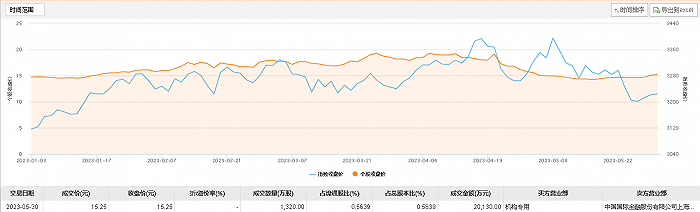 5月30日大宗交易成交1320万股,成交额2.01亿元,占当日总成交额的39.47%,成交价15.25元,较市场收盘价15.25元持平。